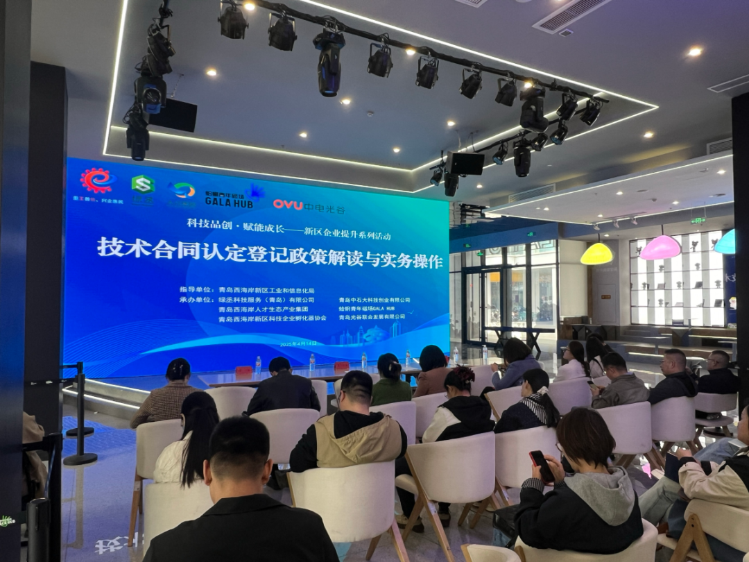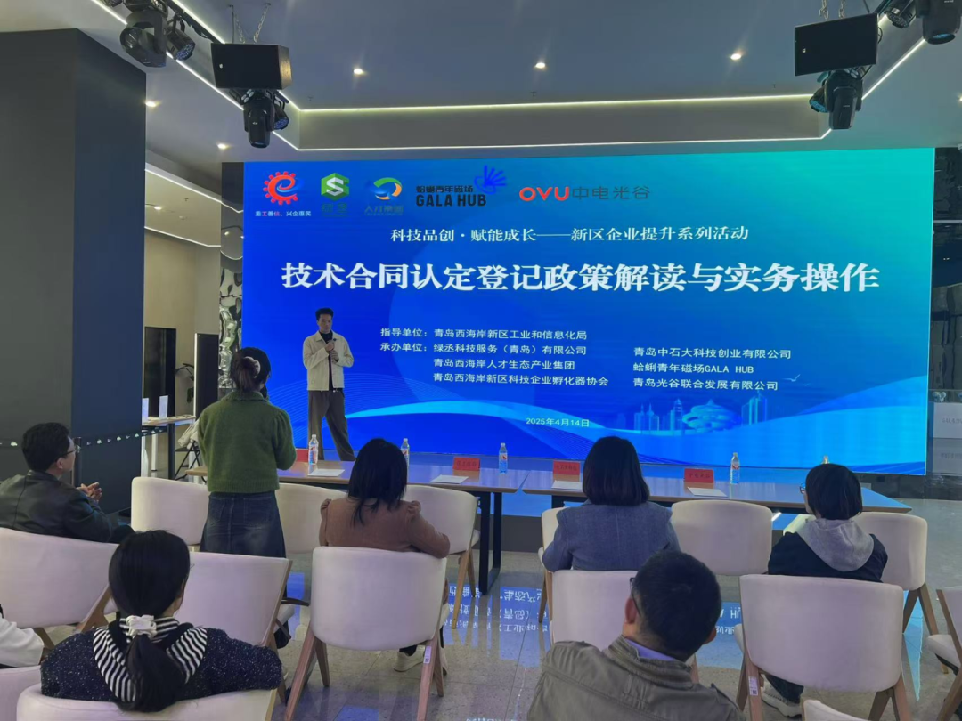 4月14日下午,由青岛西海岸新区工信局指导,绿丞科技服务(青岛)有限公司、青岛中石大科技创业有限公司、新区人才集团、中电光谷、蛤蜊青年磁场以及新区科技企业孵化器协会承办的“技术合同认定登记政策解读与实务操作”专题宣讲活动在光谷软件园GALA HUB成功举办。
